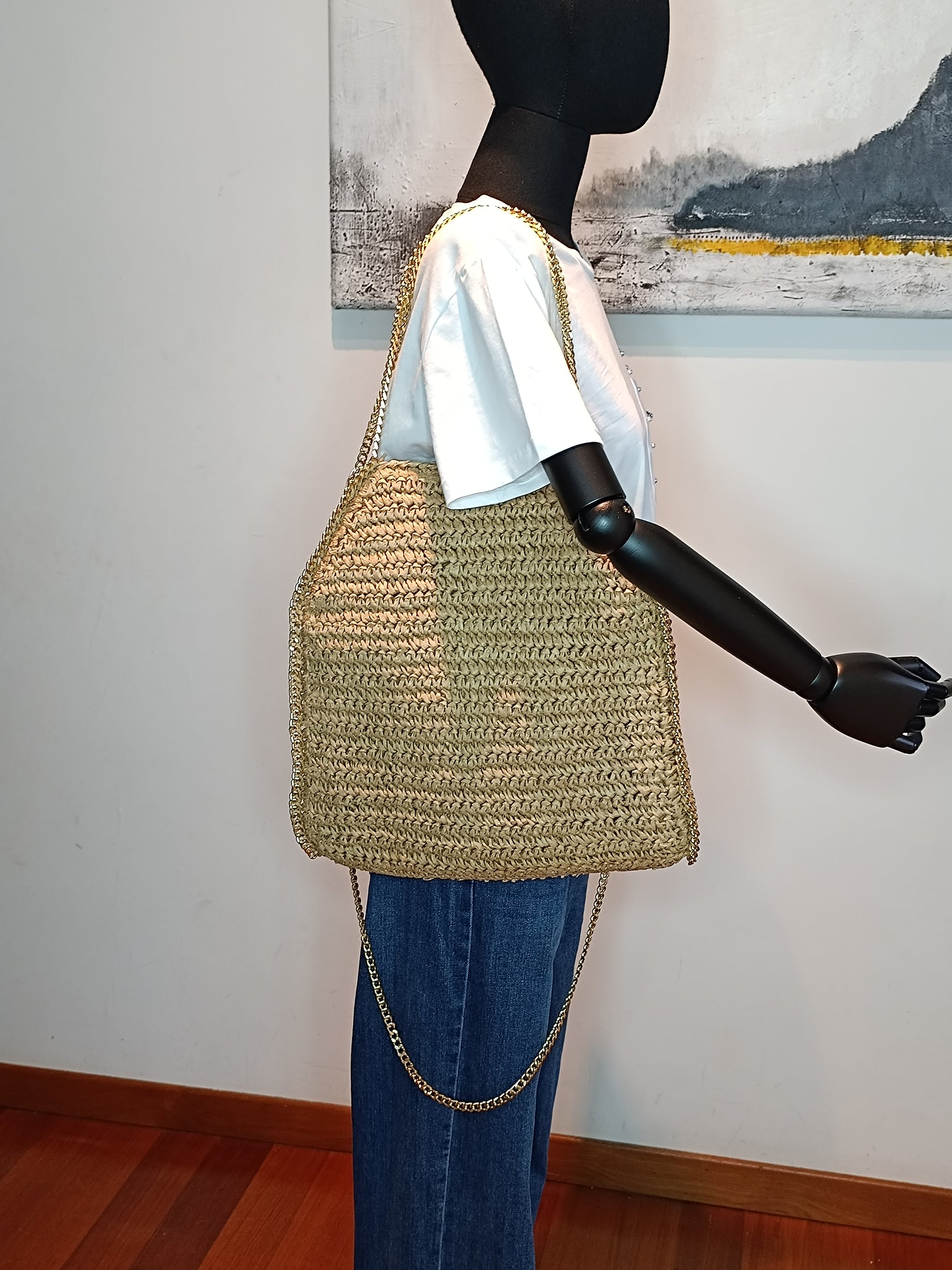 Borsa paglia con catena oro misura Grande