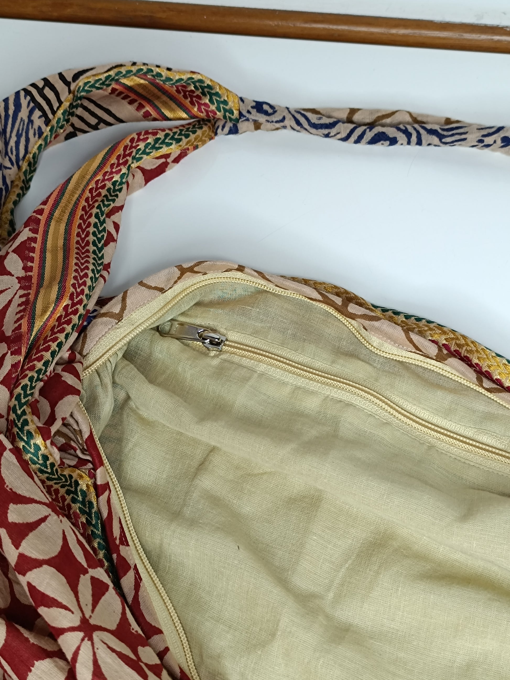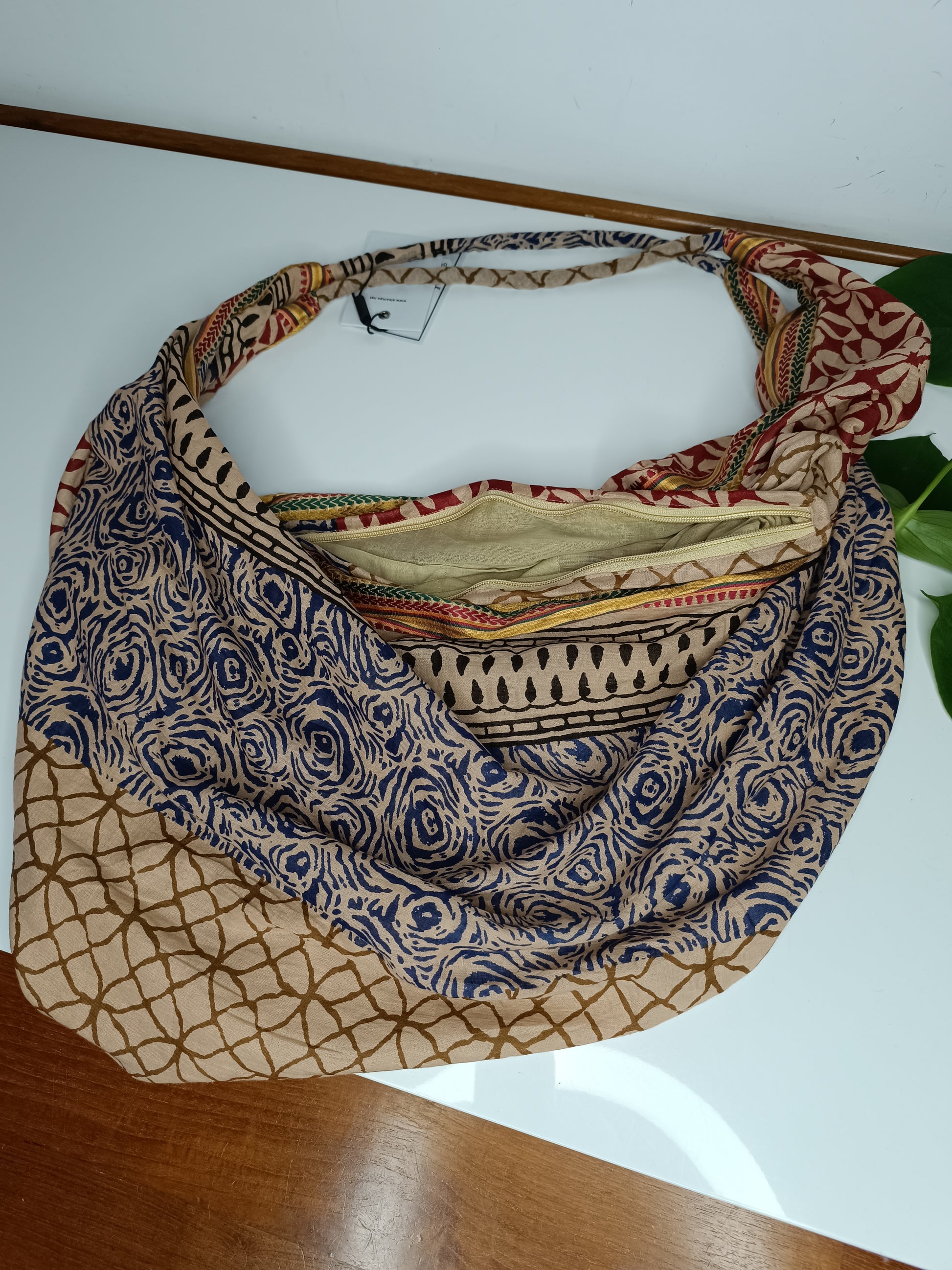 Borsa ,sacca tessuto cotone * fantasia etnica* capiente forma mezza luna* comoda a spalla*colore rosso bordeaux ,blu * rifiniture oro lungo la cerniera lampo*