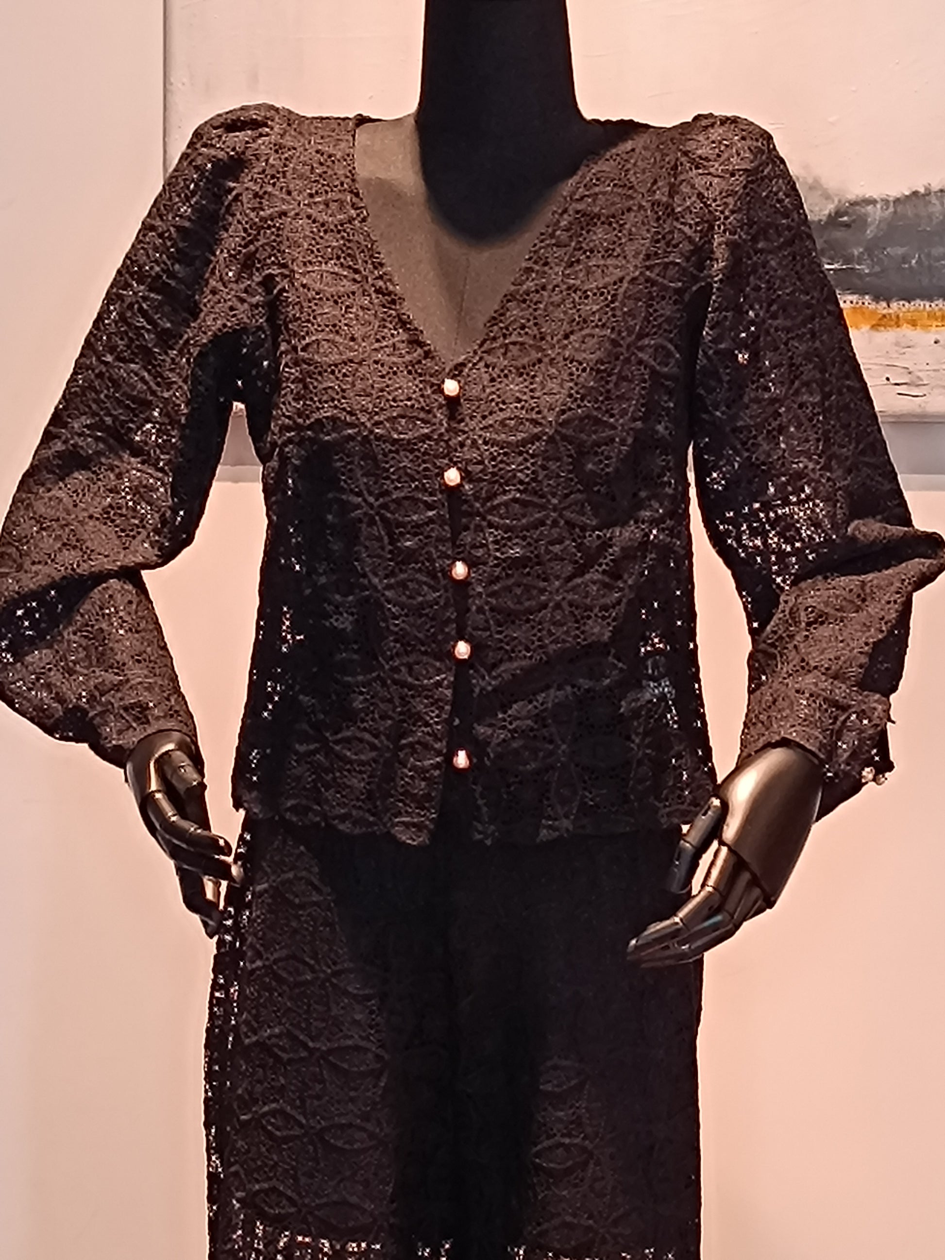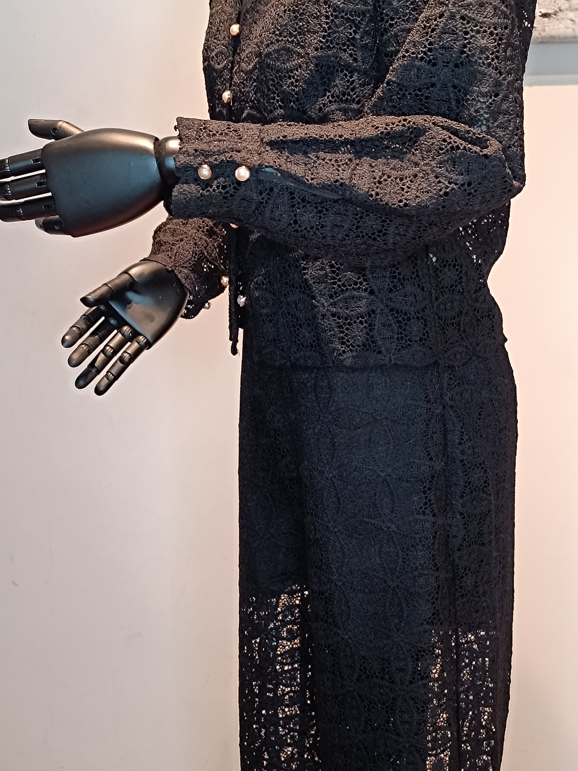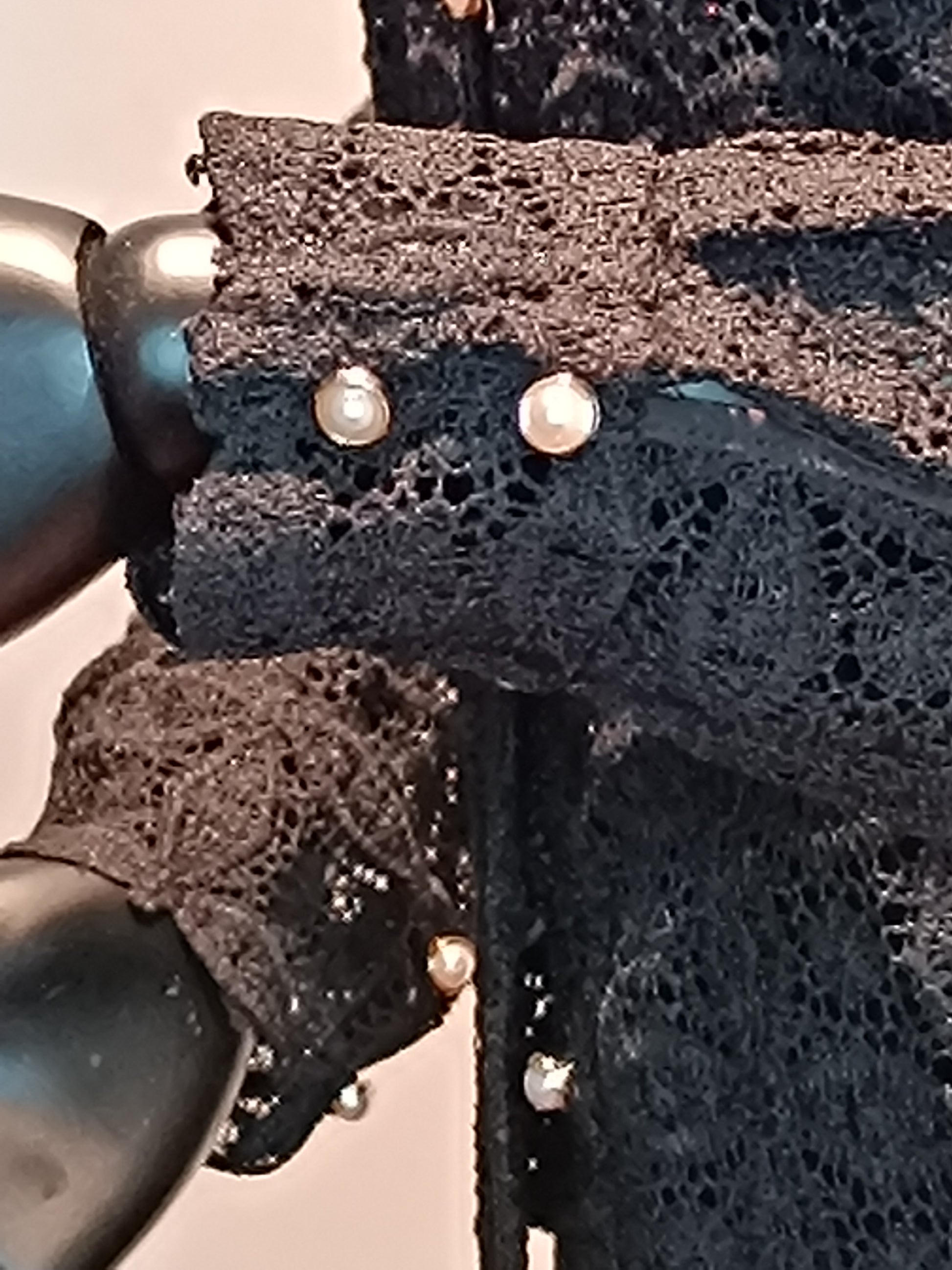 Finiture di bottoni oro e perle a chiusura e sui polsini * scollatura a V*