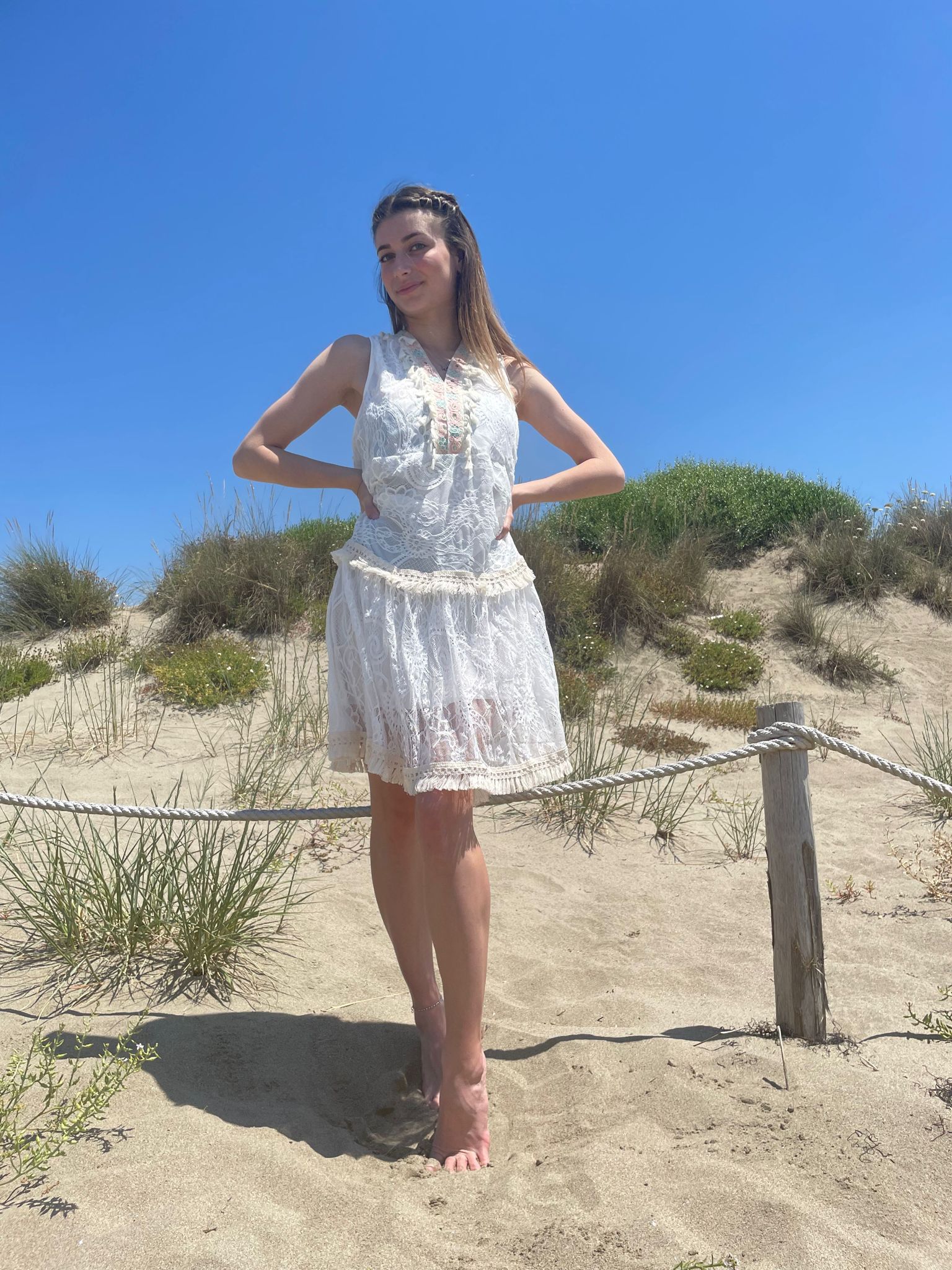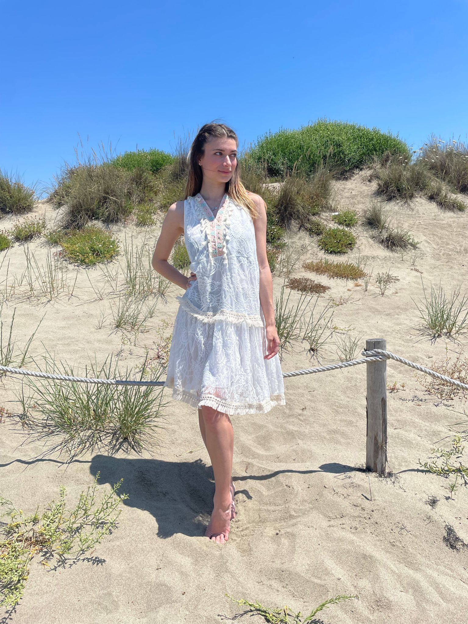 Copricostume in pizzo e nappine e scollo a V senza maniche.Presenta una trama decorativa che conferisce al capo raffinatezza e delicatezza.materiale 65%cotone e 35%poliestere.art.VP 4221