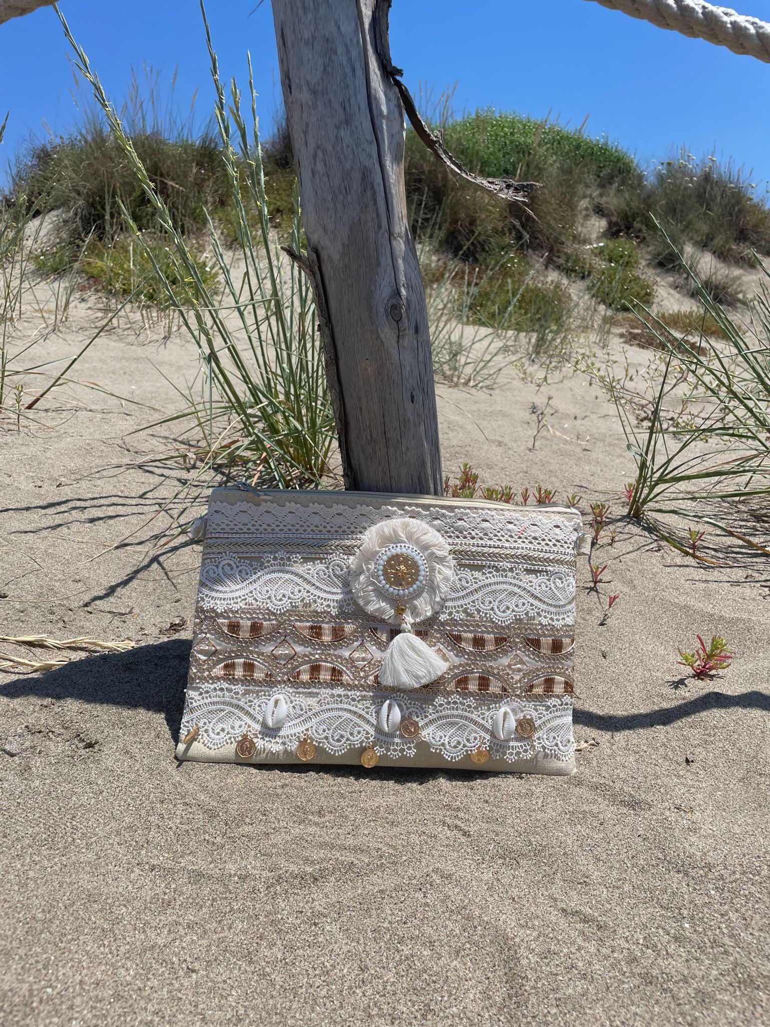 Pochette in yuta per il mare o il tempo libero impreziosito da medaglione centrale e da bellissime passamanerie.La pochette è dotata di tracolla per portarla in spalla.Musure cm 27x19.art.BG419