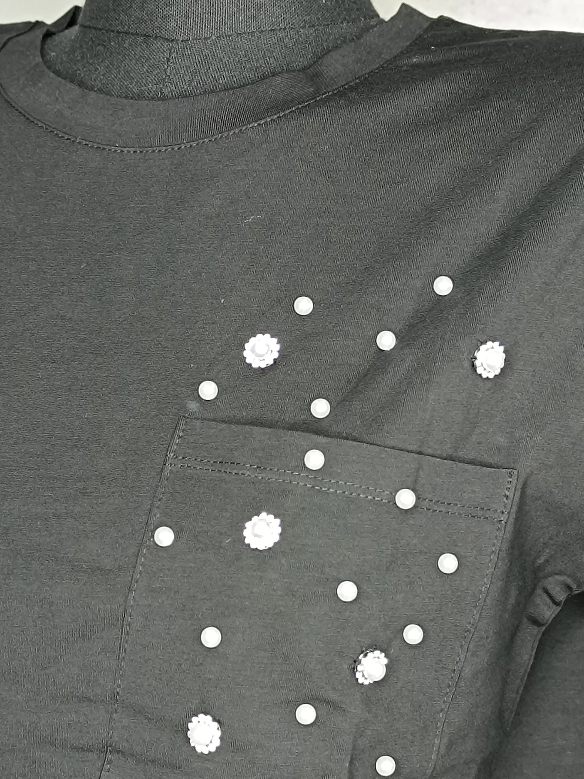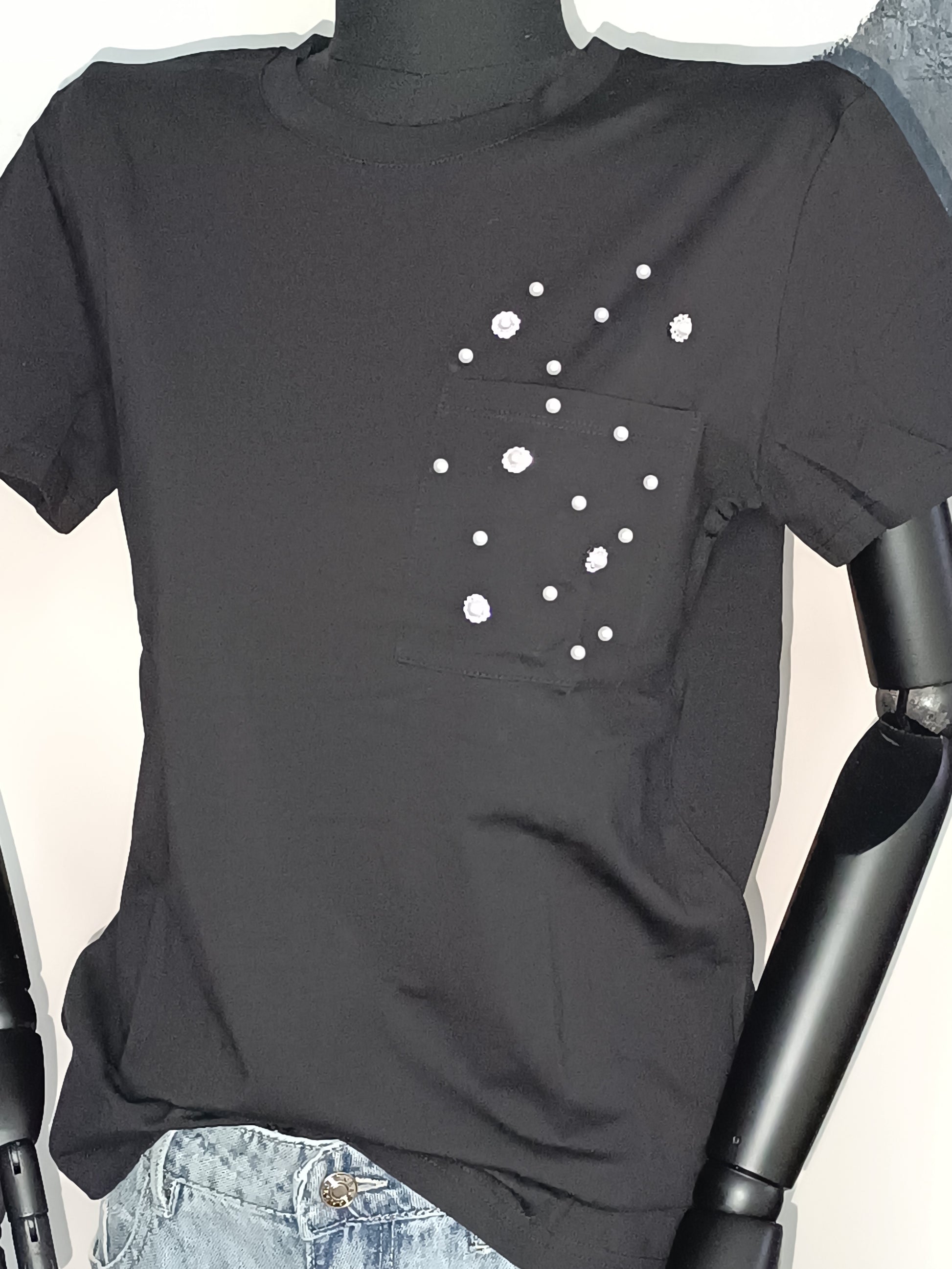 T shirt nera con applicazioni a forma di fiore in argento e perle* taglio dritto*